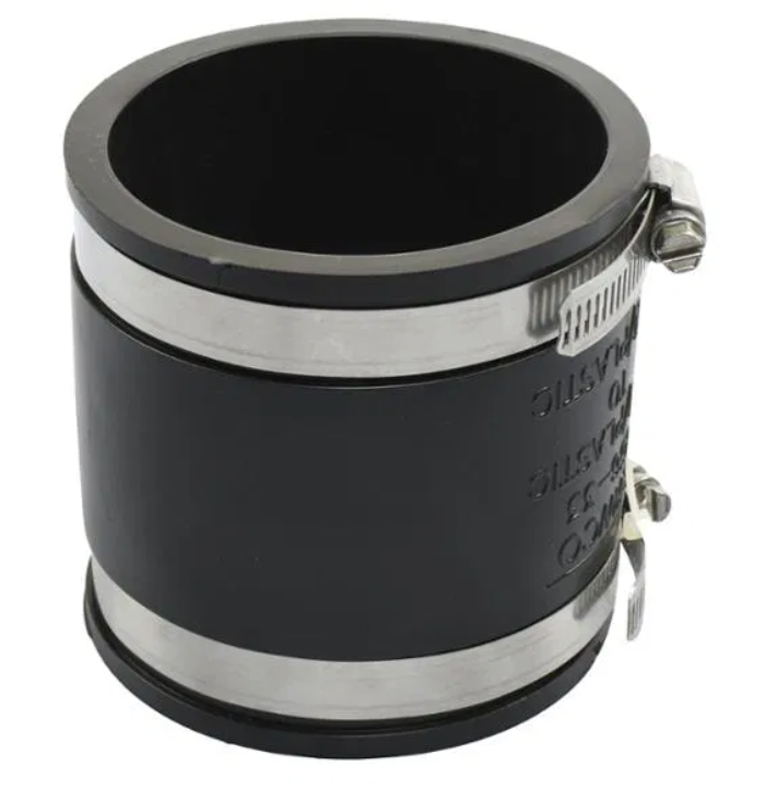 Acople para drenaje de 3 pulgadas de diámetro Coflex, útil para conectar tubos sanitarios de diferentes materiales. Está hecho de PVC negro, resistente y flexible para eliminar las fugas en la unión de tuberías de PVC, fierro fundido, barro.