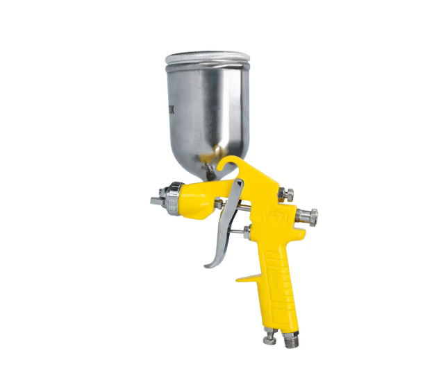 Cuerpo y deposito de gravedad fabricados en aleación de aluminio. Vaso para multiposiciones. Controles de ajuste de pintura, aire y abertura del abanico Ligera, ergonómica y compacta. Abertura del abanico formado al pintar: 50 mm Baja presión.